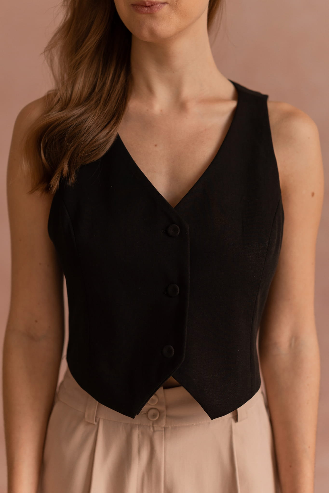 Erice to elegancki model zapinany na 3 guziki. Guziki są wykończone tym samym materiałem, co kamizelka, dzięki czemu pięknie wkomponowują się w produkt i umożliwiają dobór ulubionej biżuterii niezależnie od jej koloru.