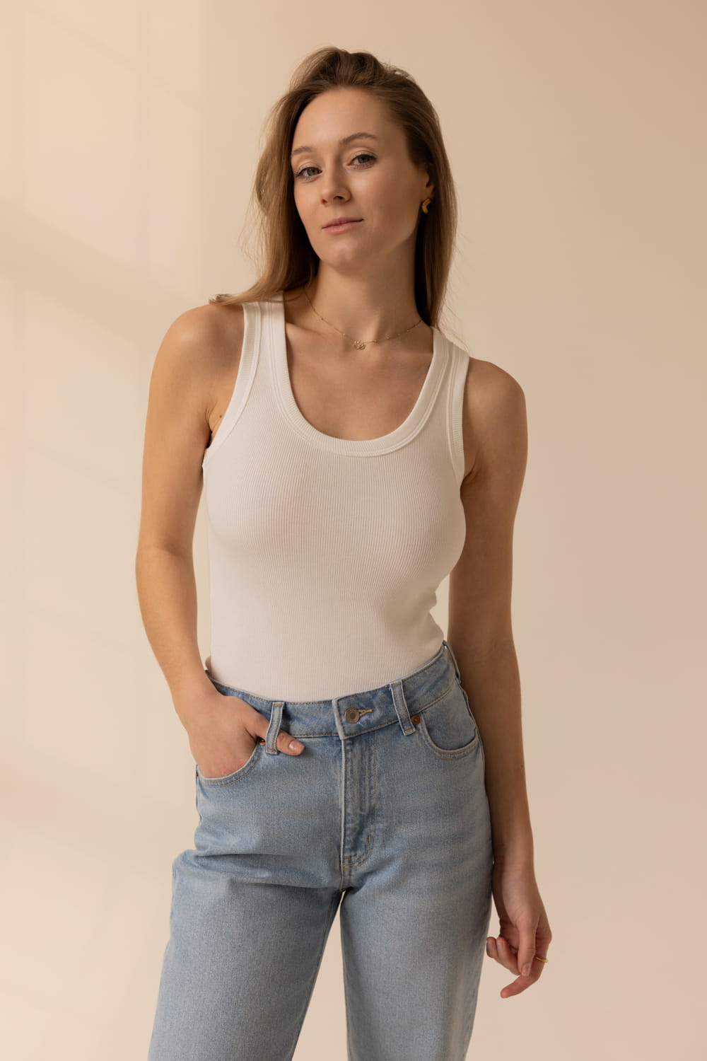 Luna posiada głęboki dekolt wykończony szeroką lamówką, która podkreśla jakość wykonania i przełamuje casualowy charakter. Szerokie ramiączka zostały zaprojektowane tak, by kryły ramiączka od biustonosza, zapewniając komfort i pewność, że top będzie wyglądał perfekcyjnie przez cały dzień.