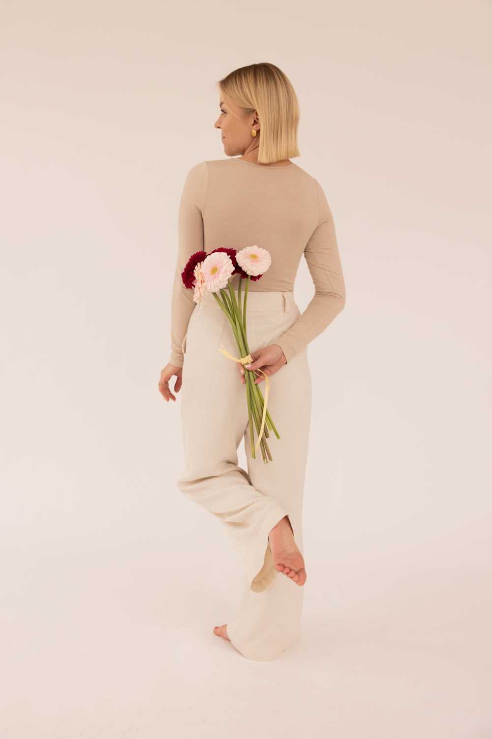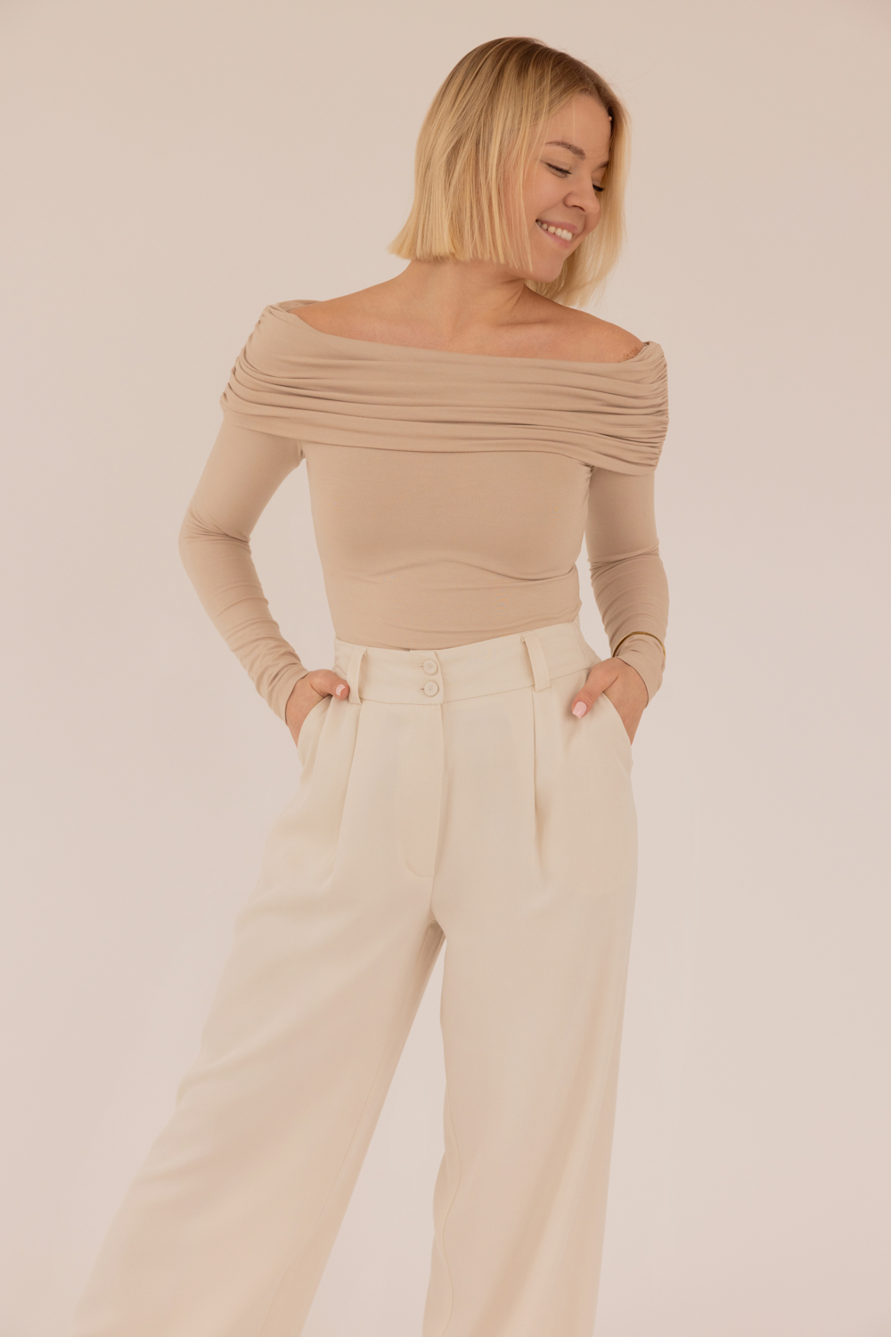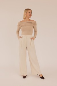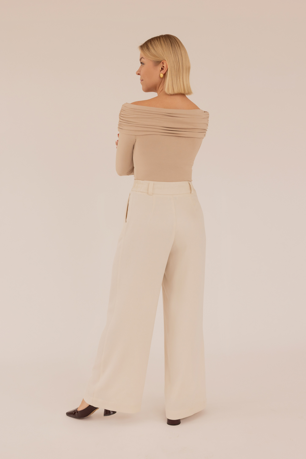 Jasnobeżowe spodnie z szerokimi nogawkami